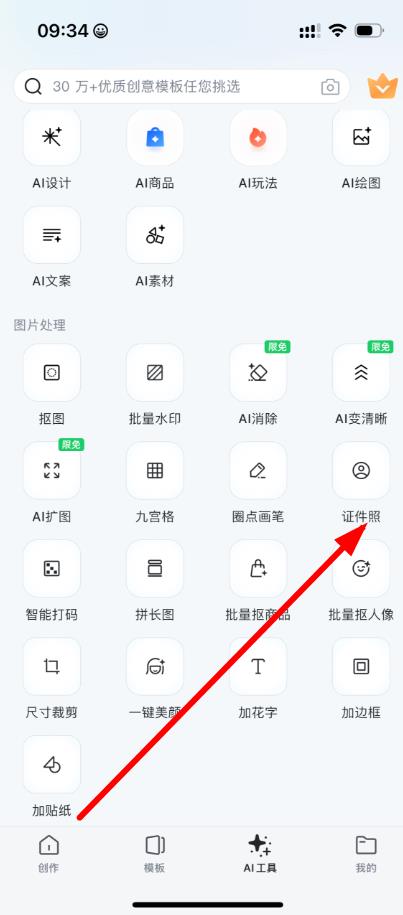 2、進入AI工具頁面后,在圖片處理板塊里找到并點擊證件照功能。