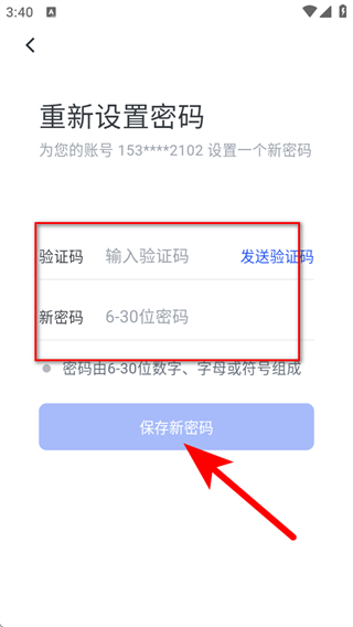 4、在重新設置密碼頁面輸入驗證碼和新密碼,點擊保存新密碼,即可完成稿定設計APP密碼的修改。