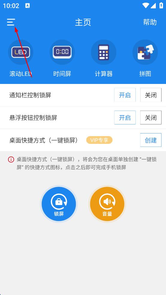1、打開智能一鍵鎖屏軟件,進(jìn)入主頁(yè),點(diǎn)擊左上角三條橫線圖標(biāo),進(jìn)入個(gè)人相關(guān)頁(yè)面。