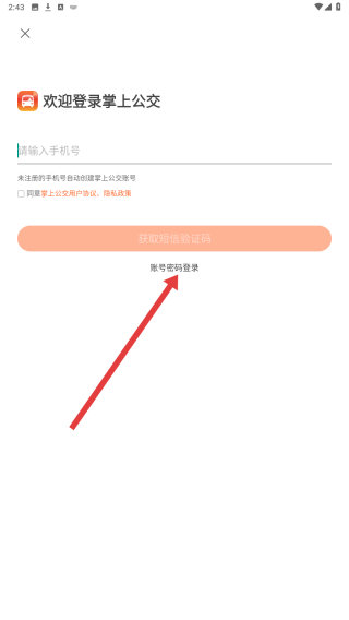 1、在掌上公交登錄界面,點(diǎn)擊賬號密碼登錄選項(xiàng),切換至密碼登錄模式,準(zhǔn)備輸入賬號密碼完成登錄操作。