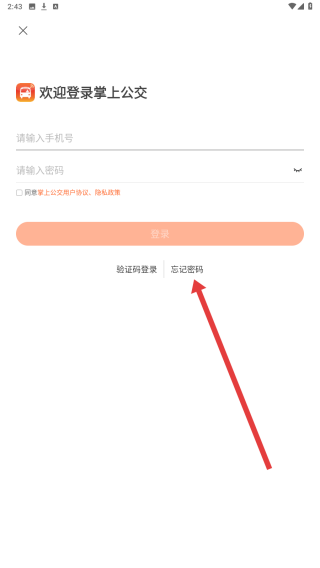 2、若忘記密碼,在掌上公交密碼登錄界面點(diǎn)擊忘記密碼按鈕,進(jìn)入密碼找回流程,開啟賬號密碼重置步驟。