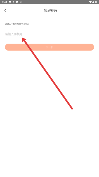 3、進(jìn)入掌上公交忘記密碼頁面后,在請輸入手機(jī)號輸入框中填寫注冊賬號的手機(jī)號,點(diǎn)擊下一步,推進(jìn)密碼找回進(jìn)程。