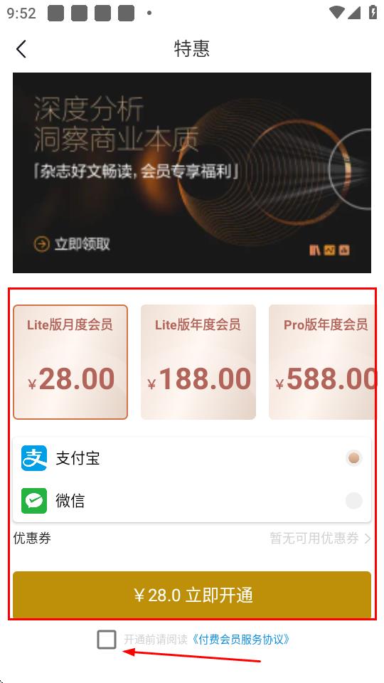 4、選擇會員套餐 ,選擇支付方式,勾選閱讀《付費會員服務協(xié)議》,點擊立即開通完成訂閱。
