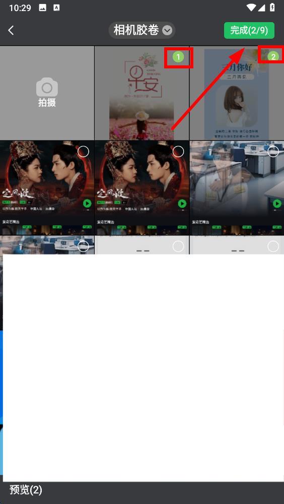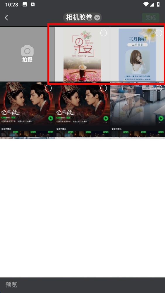 3、通過勾選圖片右上角的圓圈確認(rèn)圖片后,點擊右上角完成按鈕,進入拼圖編輯頁面。