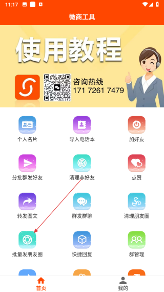 1、打開微商工具APP,在首頁點擊批量化發(fā)朋友圈功能,進入批量化發(fā)朋友圈設置頁面。