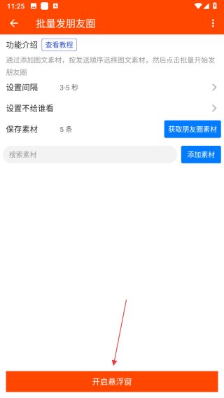 4、設置發(fā)圈間隔時間、權限,也能通過獲取朋友圈素材或添加素材按鈕準備發(fā)圈內容,最后點擊頁面底部的啟動開始發(fā)朋友圈按鈕。