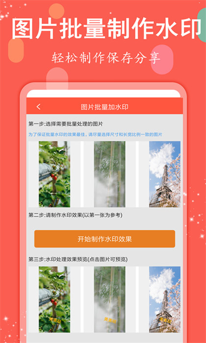 1.支持隨手快拍加水印的水印相機(jī),一拍立馬加上水印。水印效果可以放在視頻任意位置,讓你的視頻留下專屬于你的文字或Logo!
