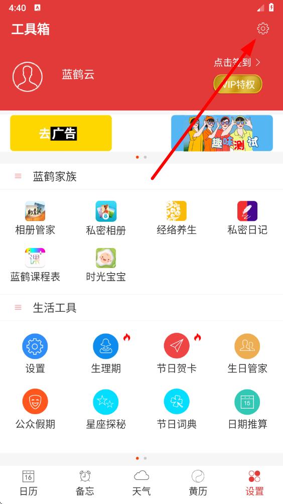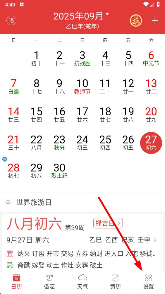 1、打開萬年歷黃歷app,進(jìn)入主界面,點(diǎn)擊底部導(dǎo)航欄最右側(cè)的設(shè)置選項(xiàng)。