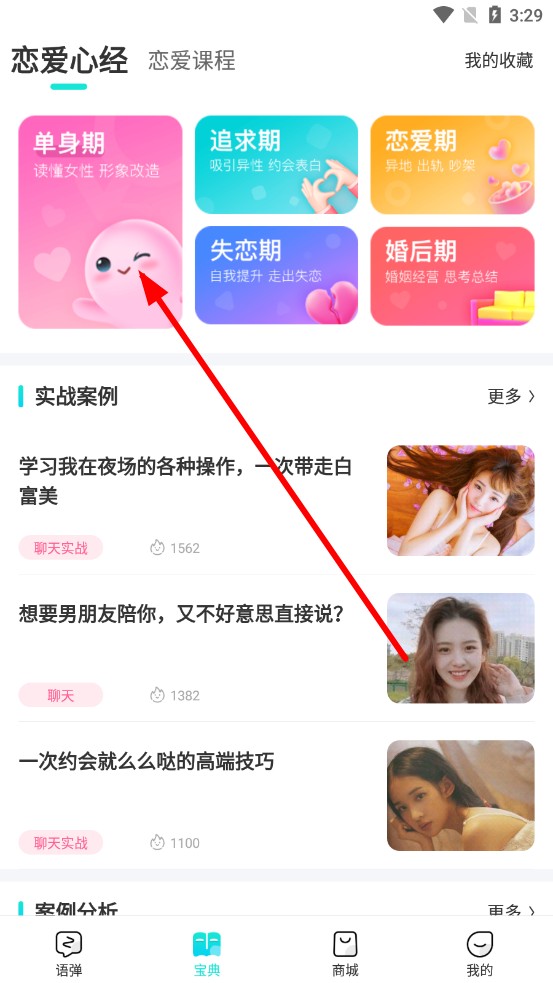 2、進入后戀愛心經板塊,按單身期、追求期、戀愛期等階段劃分,可學習技巧。