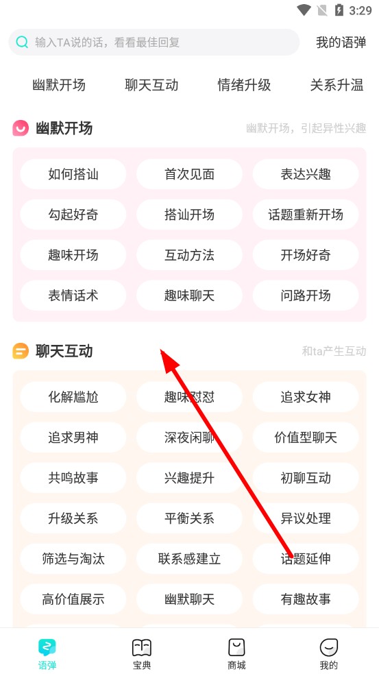 3、幽默開場、聊天互動等話術分類板塊,查看聊天話術
