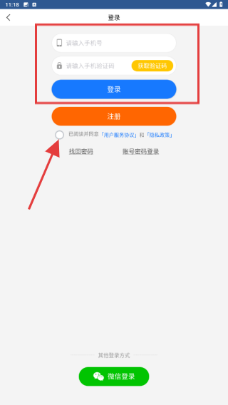 2、點(diǎn)擊后觸發(fā)登錄入口,用戶需要勾選已閱讀并同意用戶服務(wù)協(xié)議、隱私政策選項(xiàng),并使用手機(jī)賬號(hào)登錄。