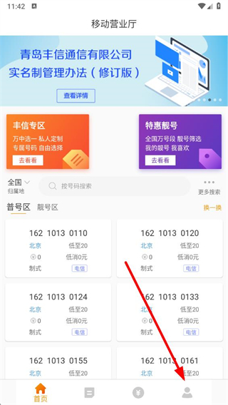 1、在移動營業(yè)廳首頁,點擊右下角人形圖標進入個人頁面。