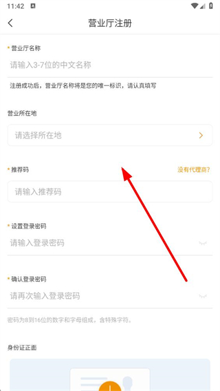 4、在注冊頁面,依次填寫營業(yè)廳名稱、營業(yè)所在地、推薦碼、登錄密碼并確認,上傳身份證正面完成注冊。