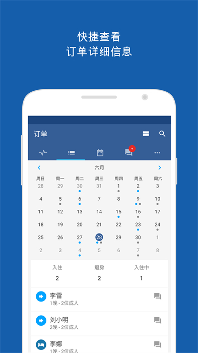 密切關(guān)注今日到店/離店訂單、新訂單、訂單取消/修改、酒店點(diǎn)評等重要信息