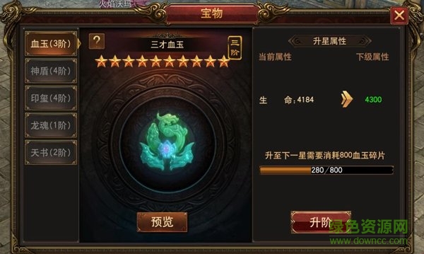 最傳奇的寶物分為五中,分別是“血玉”“神盾”“印璽”“龍魂”“天書”。每種寶物都有十個星級,當(dāng)培養(yǎng)到十星后,寶物就會成長到下一個階段。每種寶物都有十個進(jìn)階階段,有朝一日達(dá)到滿階,那便如同于最強(qiáng)的存在。