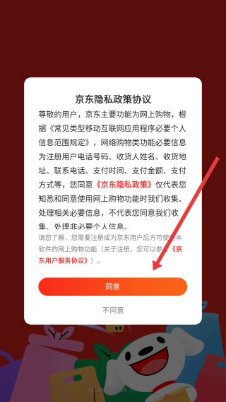 1、打開京東應用,點擊隱私政策協(xié)議彈窗中的同意按鈕,完成協(xié)議確認以進入購物界面使用功能。