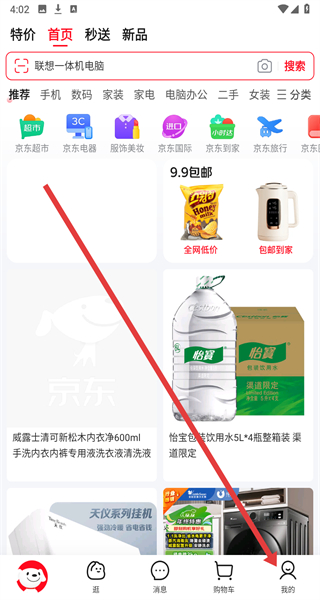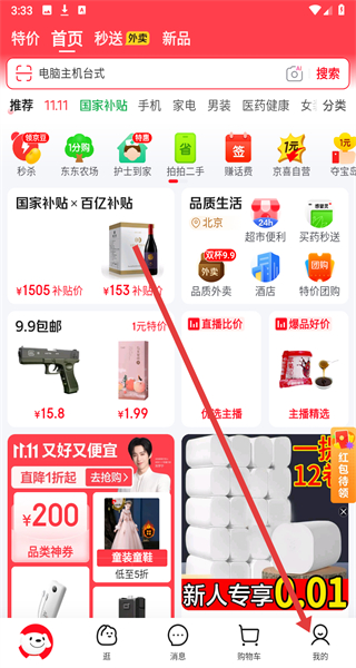 1、在進入到京東首頁中,可以點擊底部我的按鈕,進入我的主頁。