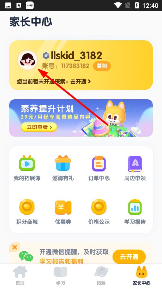 2、在家長中心頁面,點擊賬號信息區(qū)域,進入信息頁面。