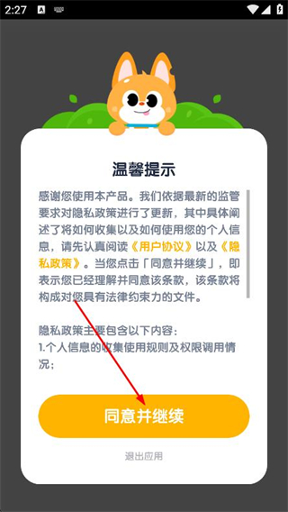 1、打開APP,在彈出的提示框中,點擊同意并繼續(xù)。