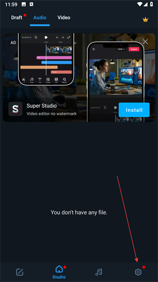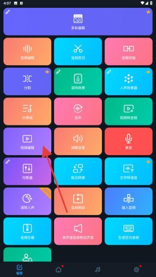 1、打開超級(jí)音樂編輯器APP,軟件會(huì)自動(dòng)匯總手機(jī)內(nèi)所有音頻文件,點(diǎn)擊視頻編輯的功能圖標(biāo)。