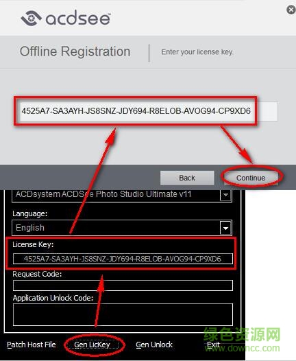 5.上面操作完成后,點(diǎn)擊“gen lickey”生成注冊(cè)碼,并復(fù)制到軟件中點(diǎn)擊“continue”(或者直接填許可證代碼:RWGBZY-SELS45-D62RK3-N5L8JE-R8ELOB-AVOG94-R3G9YC繼續(xù))