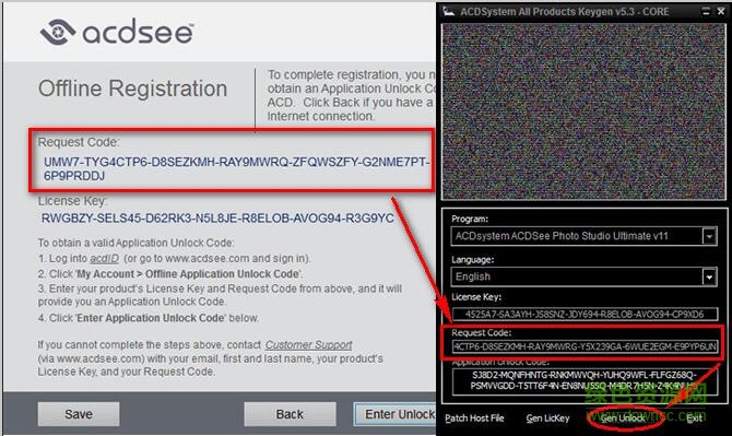 6.上面步驟完成后,軟件會(huì)生成一個(gè)request code,將它復(fù)制到注冊(cè)機(jī)對(duì)應(yīng)地方,點(diǎn)擊“gen unlock”,會(huì)生成激活碼