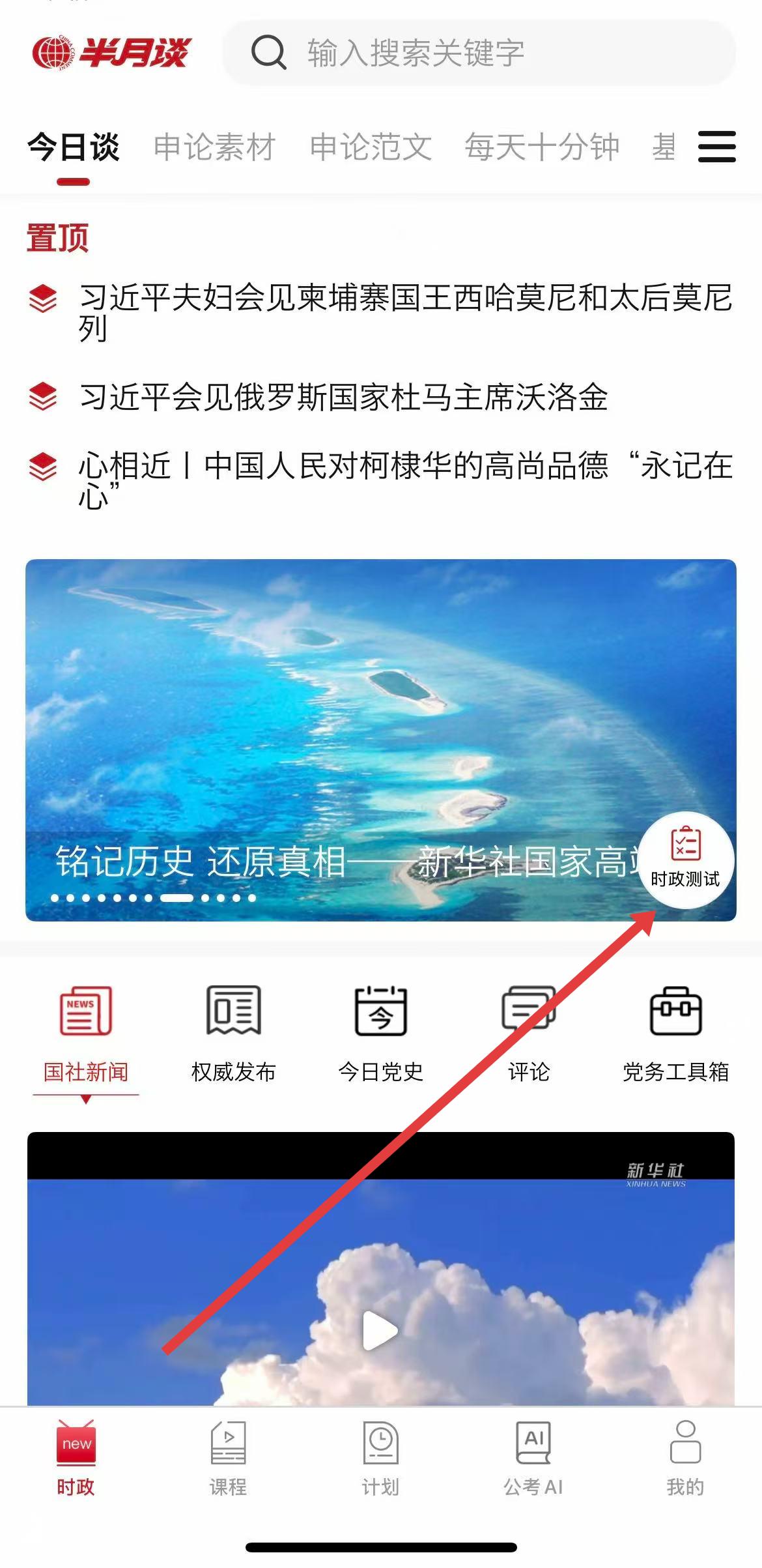 1、打開(kāi)半月談APP,找到右側(cè)的懸浮按鍵時(shí)政測(cè)試,點(diǎn)擊進(jìn)入。