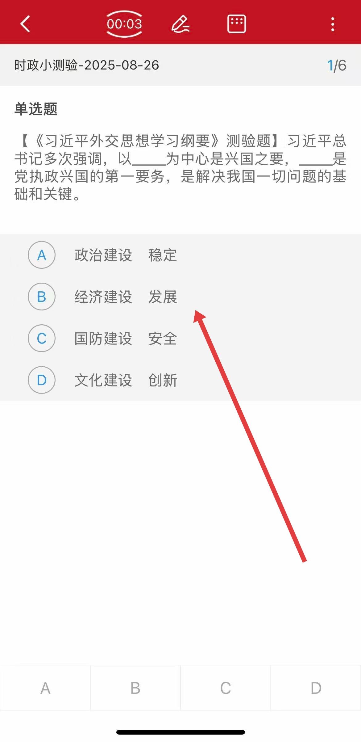 3、進(jìn)入時(shí)政小測(cè)驗(yàn)頁(yè)面,完成每日測(cè)驗(yàn),即可成功打卡。