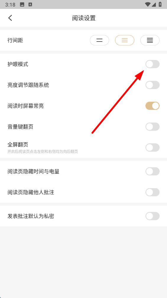 4、在閱讀設(shè)置界面,找到護眼模式選項,點擊其右側(cè)的開關(guān)按鈕,將其開啟即可。