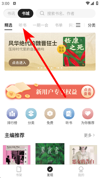 1、在掌閱精選書城頁面,點擊聽書選項,進入聽書界面。