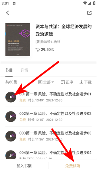 3、在書籍詳情頁面,選擇想聽的書、點擊免費試聽按鈕,進入聽書播放頁面。