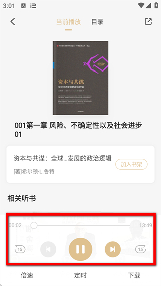 4、在聽書播放頁面,即可開始聽書,且可對播放進行相關(guān)操作。