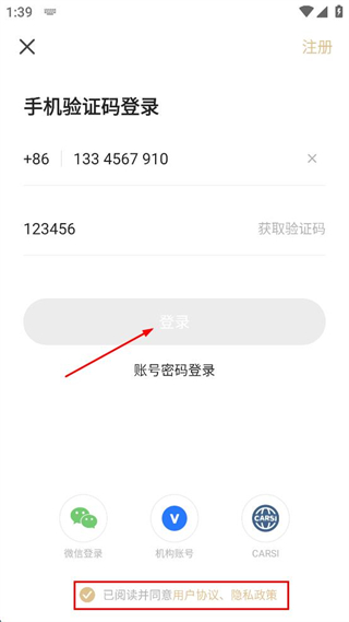 4、勾選同意用戶協(xié)議和隱私政策,點擊“登錄”按鈕。
