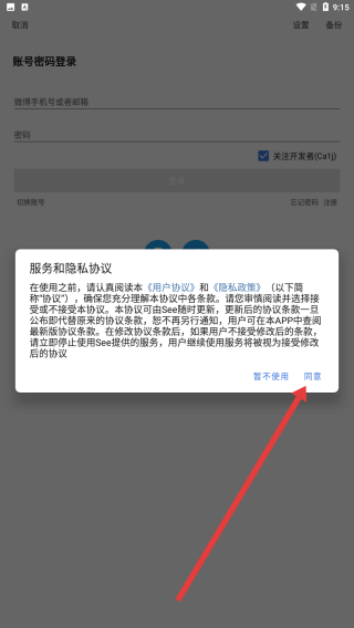 1、在進(jìn)入到第三方微博see應(yīng)用后,點擊彈窗中的同意按鈕,開始進(jìn)入使用。