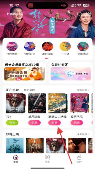 1、打開中國電影APP,進入到首頁內(nèi),點擊購票的按鈕。