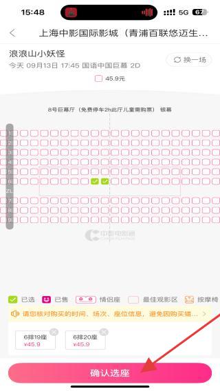 4、進入選位的界面內(nèi),選好位置后點擊確認(rèn)選座的按鈕即可。