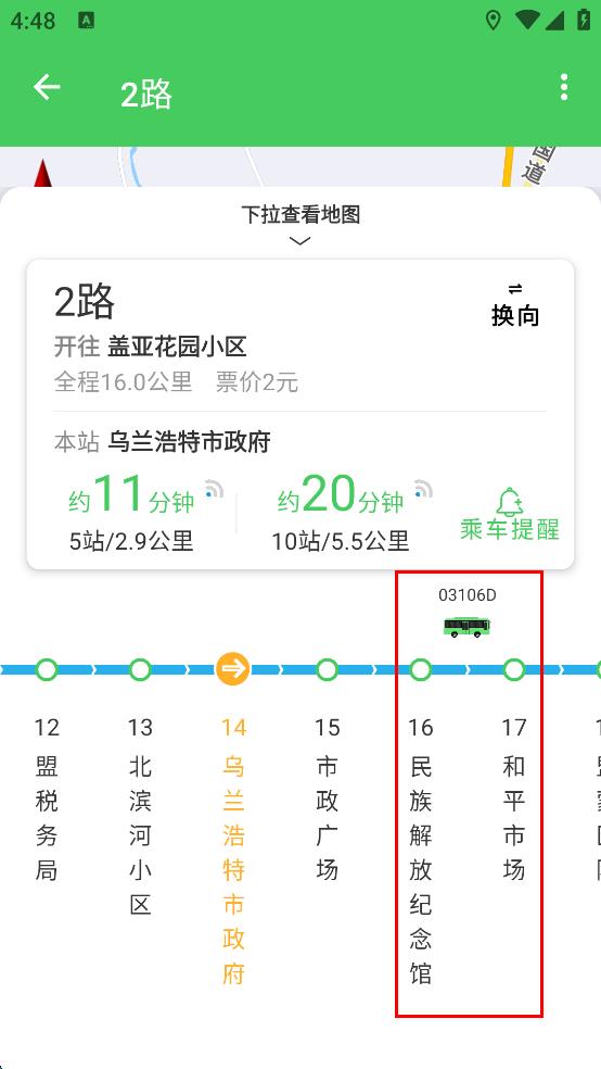 3、進(jìn)入2路公交詳情頁面后,可查看該線路的全程信息,包括全程公里數(shù)、票價(jià),以及本站后續(xù)站點(diǎn)的預(yù)計(jì)時(shí)間、距離等。