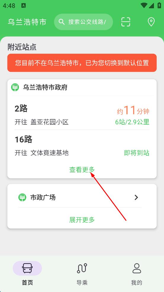 2、在公交查詢頁面,找到“附近站點(diǎn)”板塊下的站點(diǎn),在該站點(diǎn)顯示的公交線路中,點(diǎn)擊“查看更多”,找到公交并點(diǎn)擊進(jìn)入其詳情頁面。