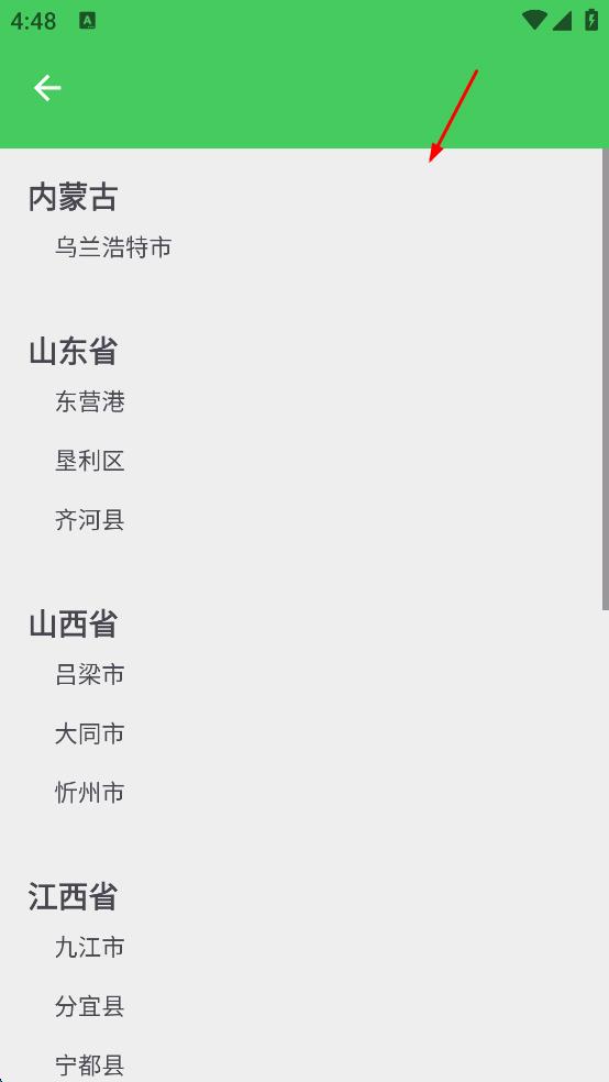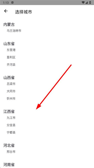 2、在選擇城市頁面,瀏覽并選擇目標(biāo)城市,例如可選擇山西省忻州市、江西省九江市等。