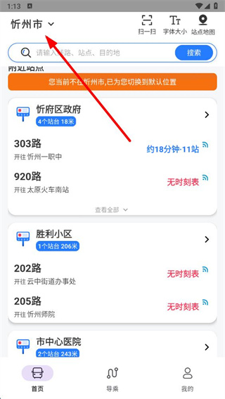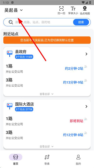 1、在易公交app首頁,點(diǎn)擊左上角城市名稱區(qū)域,進(jìn)入選擇城市頁面。