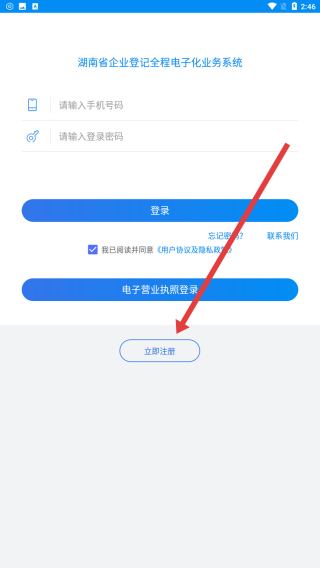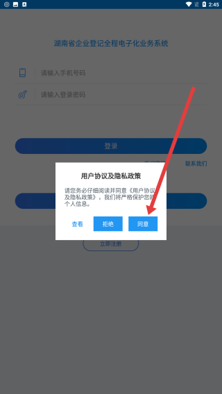 1、在進(jìn)入到湖南企業(yè)登記APP后,點(diǎn)擊同意按鈕開始登錄操作。