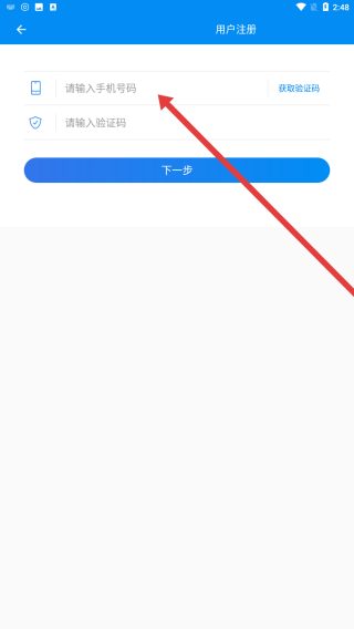 3、在跳轉(zhuǎn)到用戶注冊(cè)頁(yè)面中,點(diǎn)擊輸入框輸入手機(jī)號(hào)碼,獲取驗(yàn)證碼后完成注冊(cè)操作。