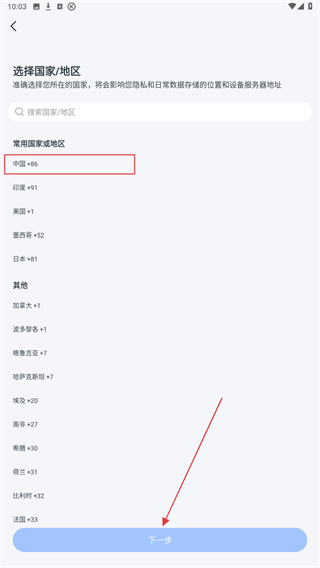 3、注冊前,需先選擇國家/地區(qū),選擇后點擊下一步。