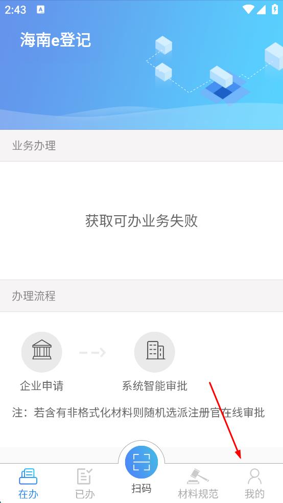 3、在APP主界面,若獲取可辦業(yè)務(wù)失敗,可點擊底部“我的”選項,進入個人中心頁面,查看個人相關(guān)設(shè)置。