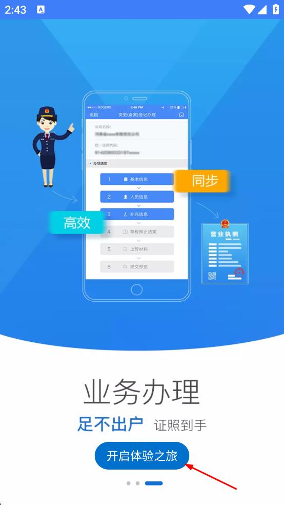 2、在業(yè)務(wù)辦理展示頁面,點擊“開啟體驗之旅”按鈕,進入APP主界面,準備進行業(yè)務(wù)辦理等操作。
