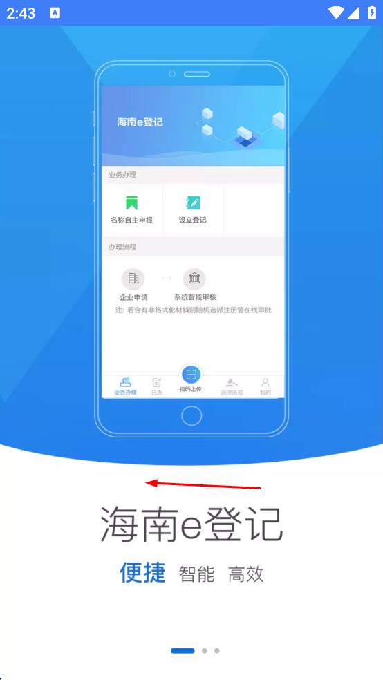 1、打開海南e登記APP,在展示頁面向左滑動,瀏覽APP的功能介紹,了解其便捷、智能、高效的特點。