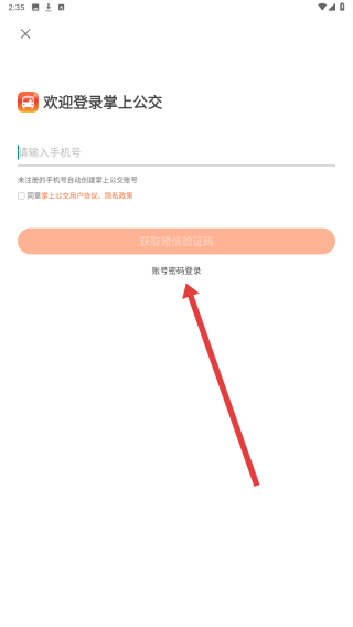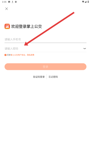 3、在密碼登錄界面,輸入手機(jī)號(hào)后填寫對(duì)應(yīng)密碼,勾選協(xié)議,點(diǎn)擊登錄按鈕,完成掌上公交賬號(hào)登錄。