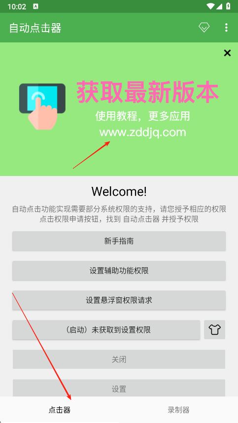 1、打開自動點(diǎn)擊器,進(jìn)入主界面,可看到新手指南,設(shè)置輔助功能權(quán)限等選項(xiàng),若要獲取最新版本或查看使用教程,可點(diǎn)擊對應(yīng)提示中的網(wǎng)址了解相關(guān)信息。