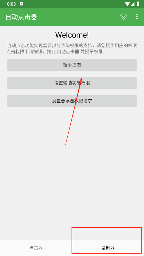 3、權(quán)限設(shè)置完成后,回到主界面,可使用點(diǎn)擊器功能進(jìn)行自動點(diǎn)擊操作,也能切換到錄制器,錄制點(diǎn)擊操作流程,方便后續(xù)重復(fù)執(zhí)行相關(guān)點(diǎn)擊任務(wù),提升操作效率。