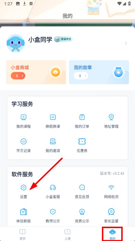 1、打開小盒課堂app點擊底部導航欄中的我的選項,在軟件服務板塊點擊設置選項進入設置界面。